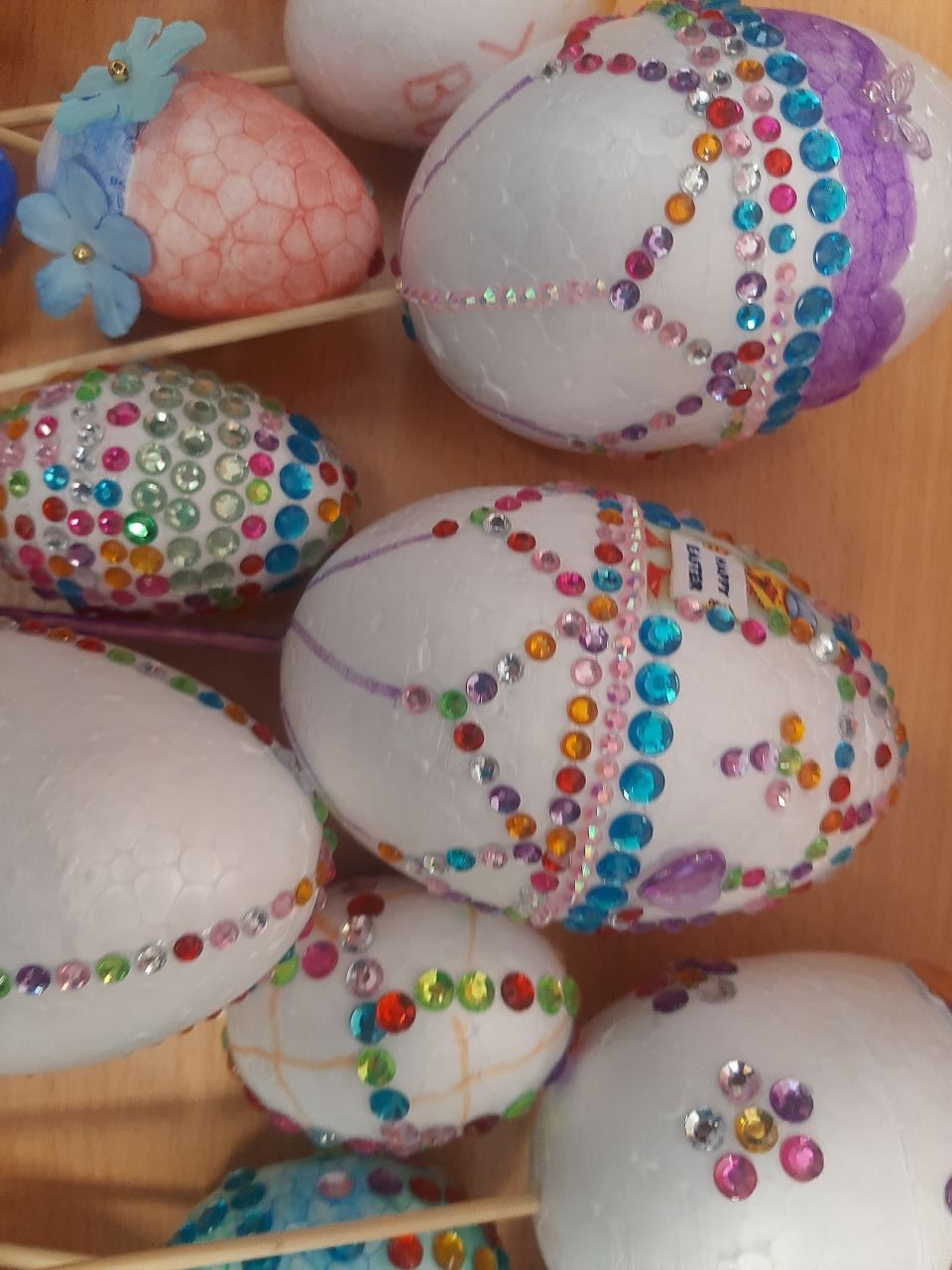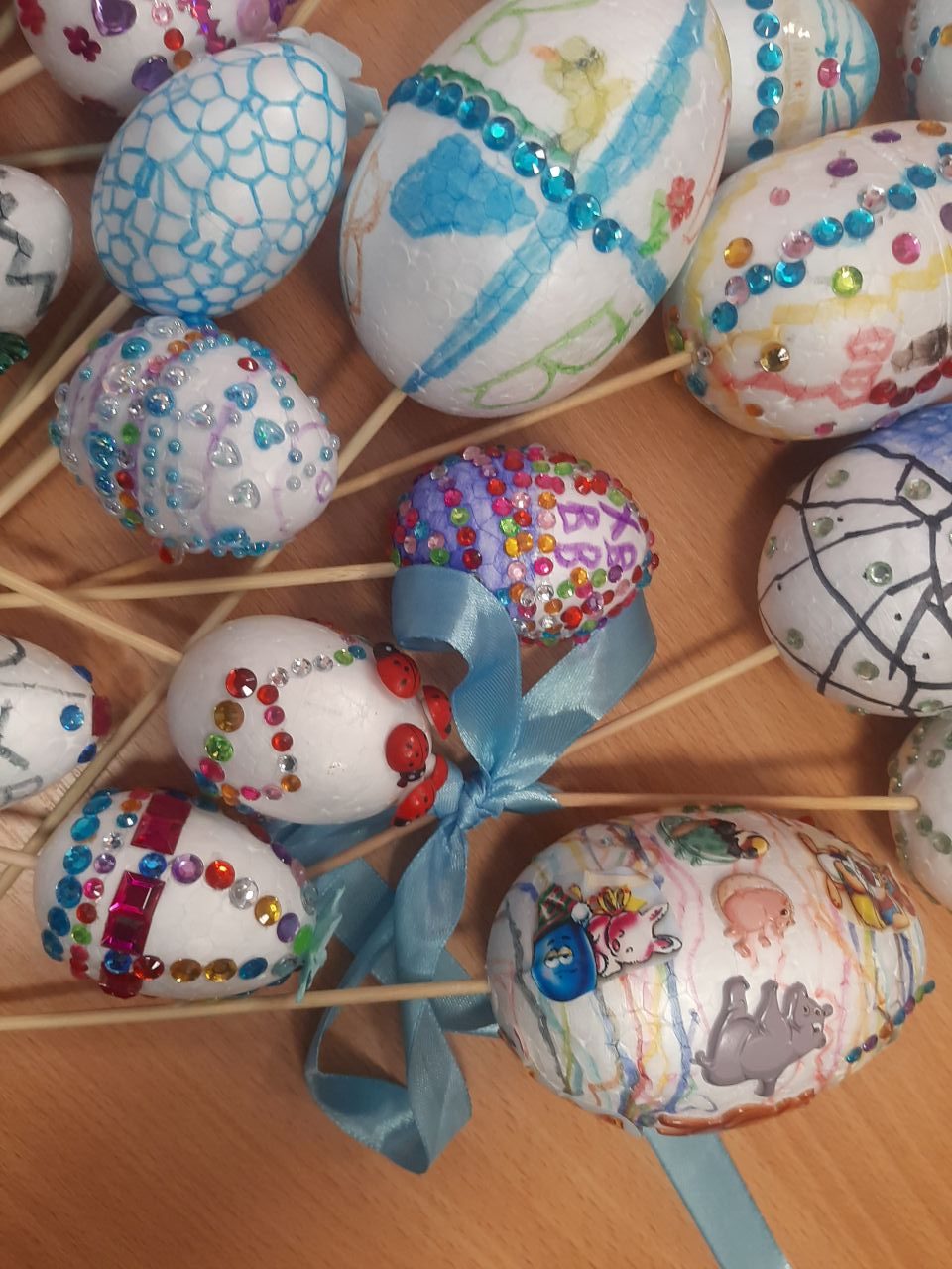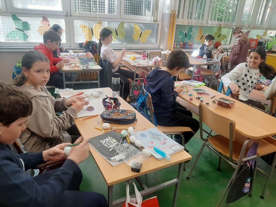 На часу ликовне културе ученици одељења 4-3 украшавали су јаја од стиропора. Овај час смо искористили и да се подсетимо симболике чуваркуће – првог офарбаног јајета, као и обичаја који су везани за Васкрс.