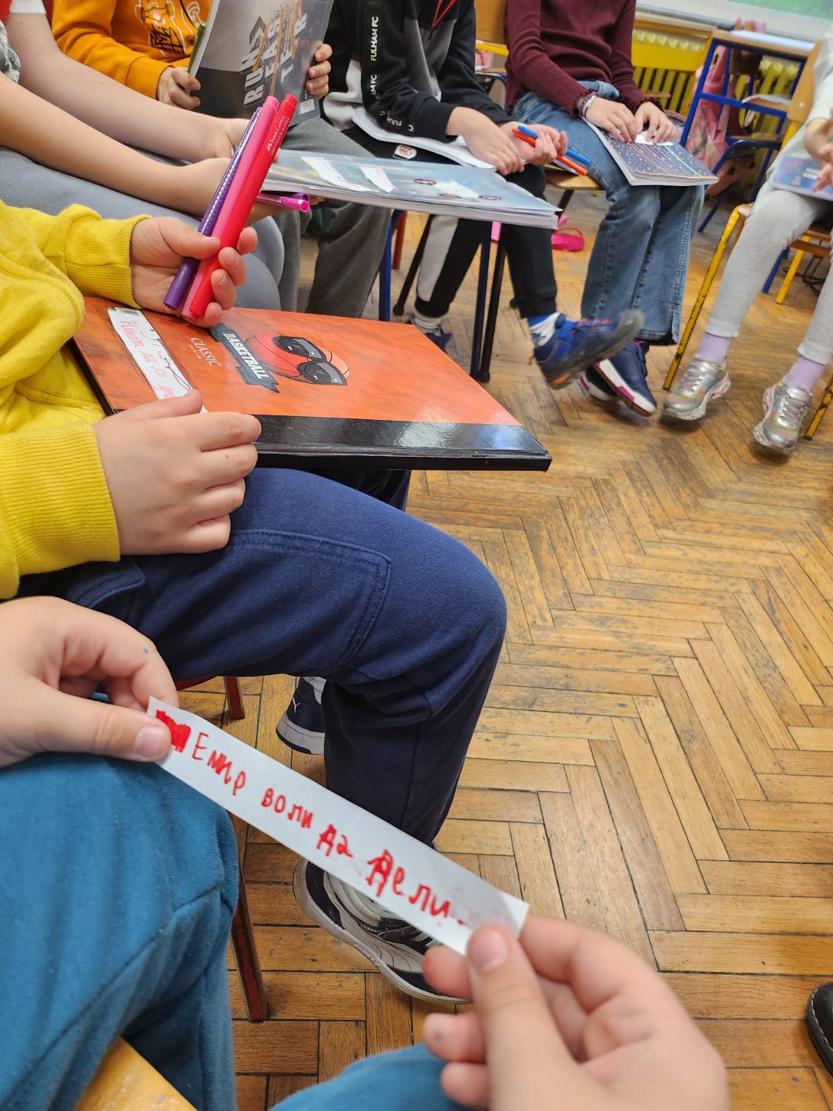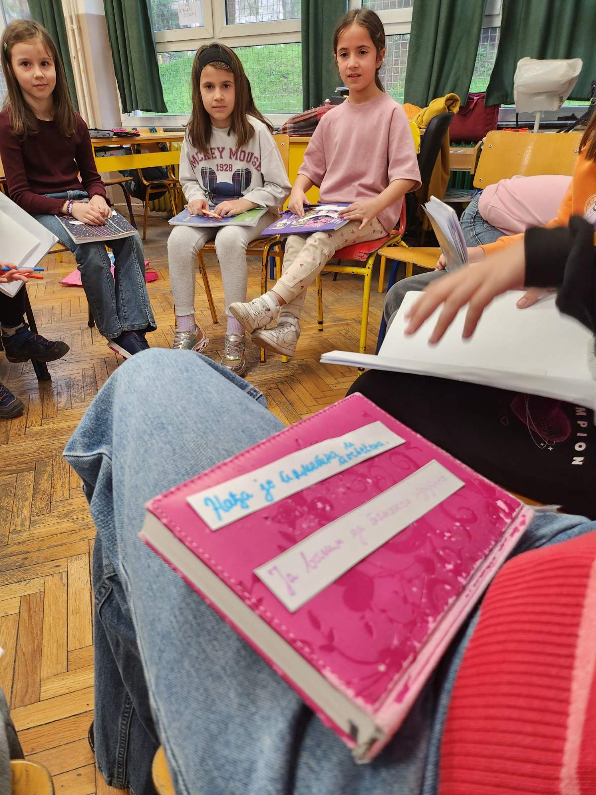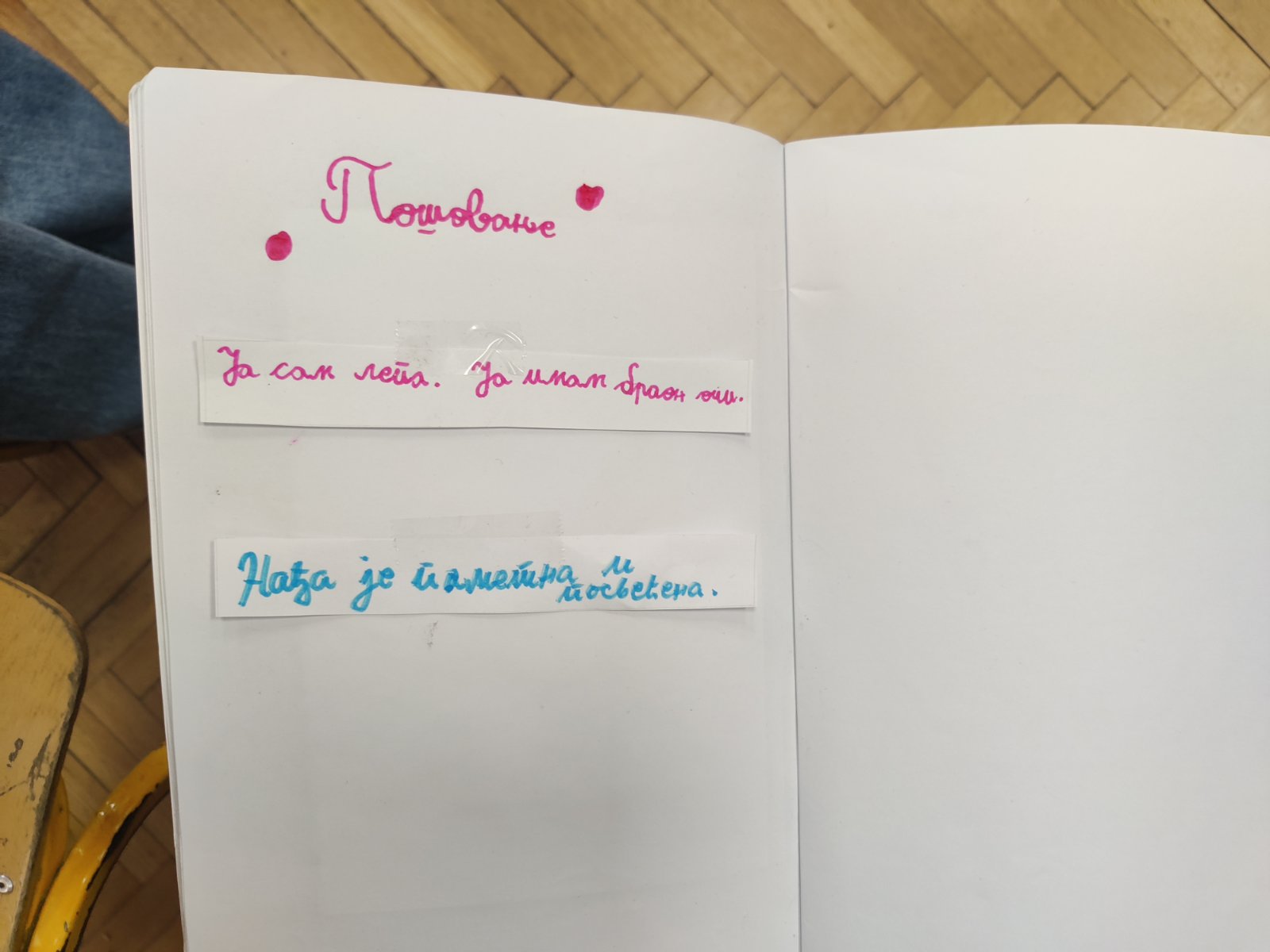 На часу грађанског васпитања након прочитане приче о леопарду Лили која је уместо црних имала ружичасте пеге и успешно је научила шта је то поштовање и самопоштовање, ученици је требало да примене ове вредности на делу. Прво су писали поруке о својим лепим особинама (самопоштовање), а затим о туђим (поштовање). На крају смо лепе поруке разменили и свако је своје залепио у свеску.